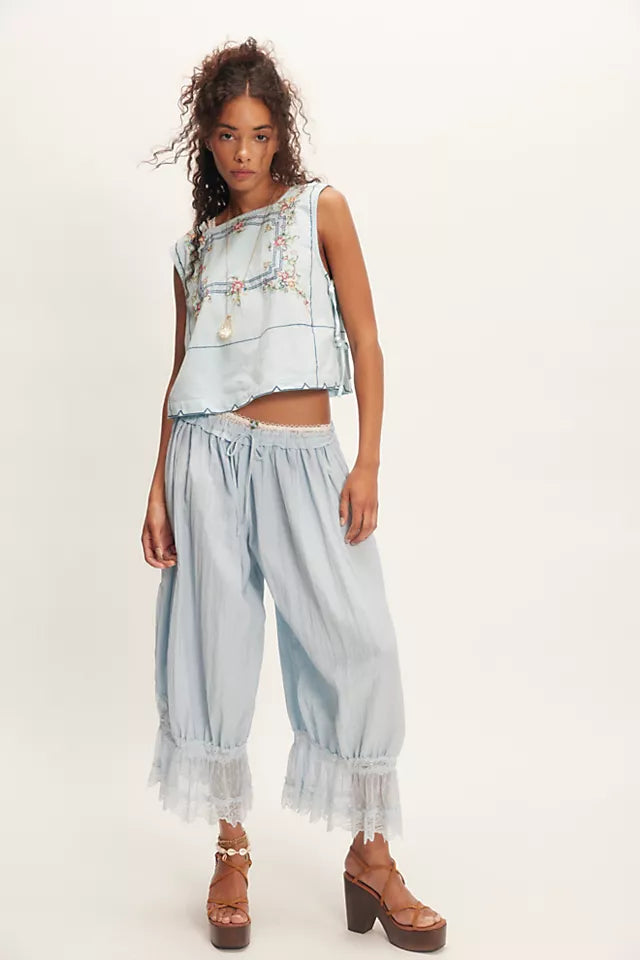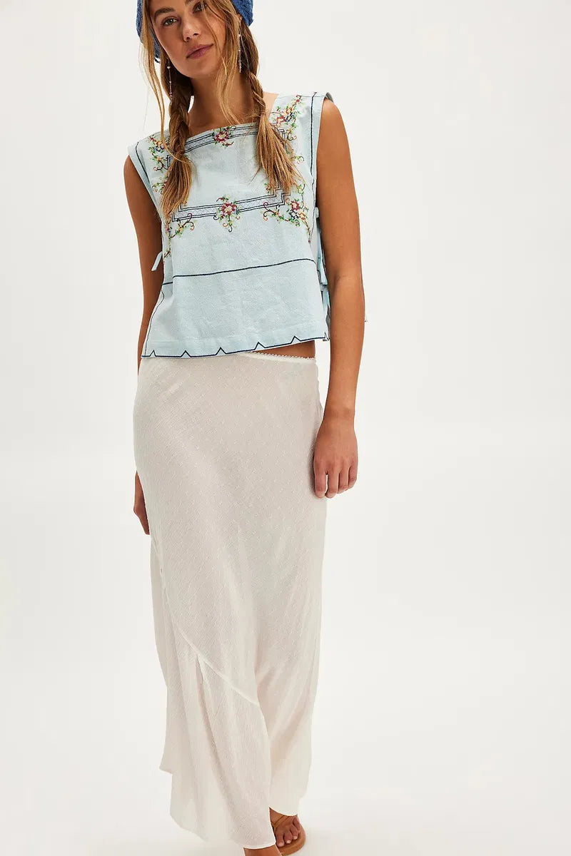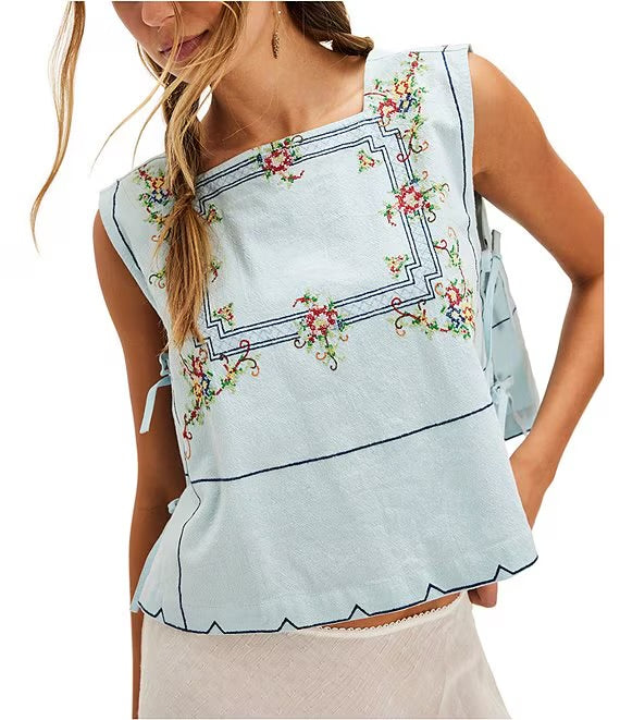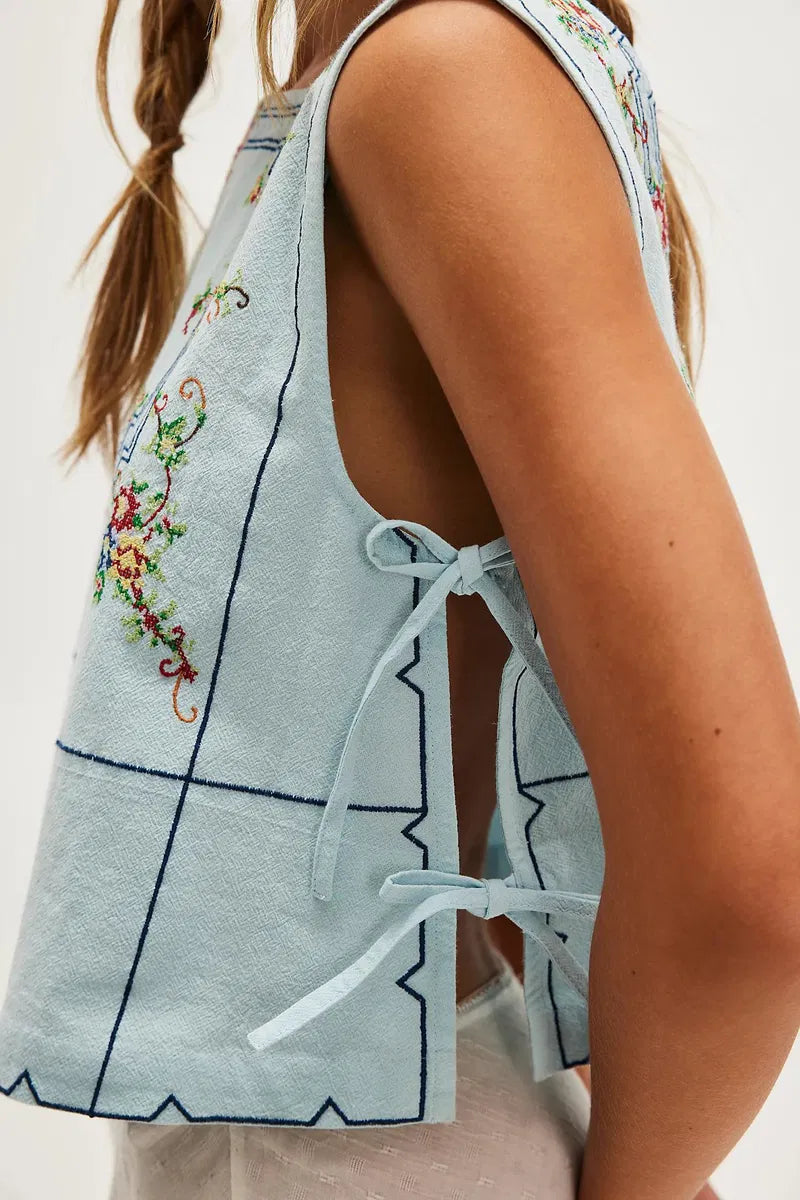 Meet us in the secret garden wearing this stunning top, featured in a sleeveless, boxy style with charming cross-stitch embroidery and tie sides for the perfect dainty touch.