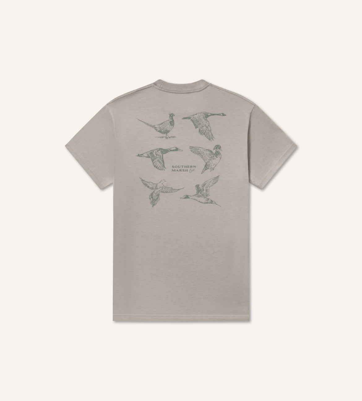 Breathable and lightweight, our SEAWASH™️ - Field Sketches short sleeve tee features an assortment of custom drawn fowl on the back and a handy front pocket. Made for comfort and all day wear, this tee is perfect for layering with our fleece pullovers and canvas jackets.