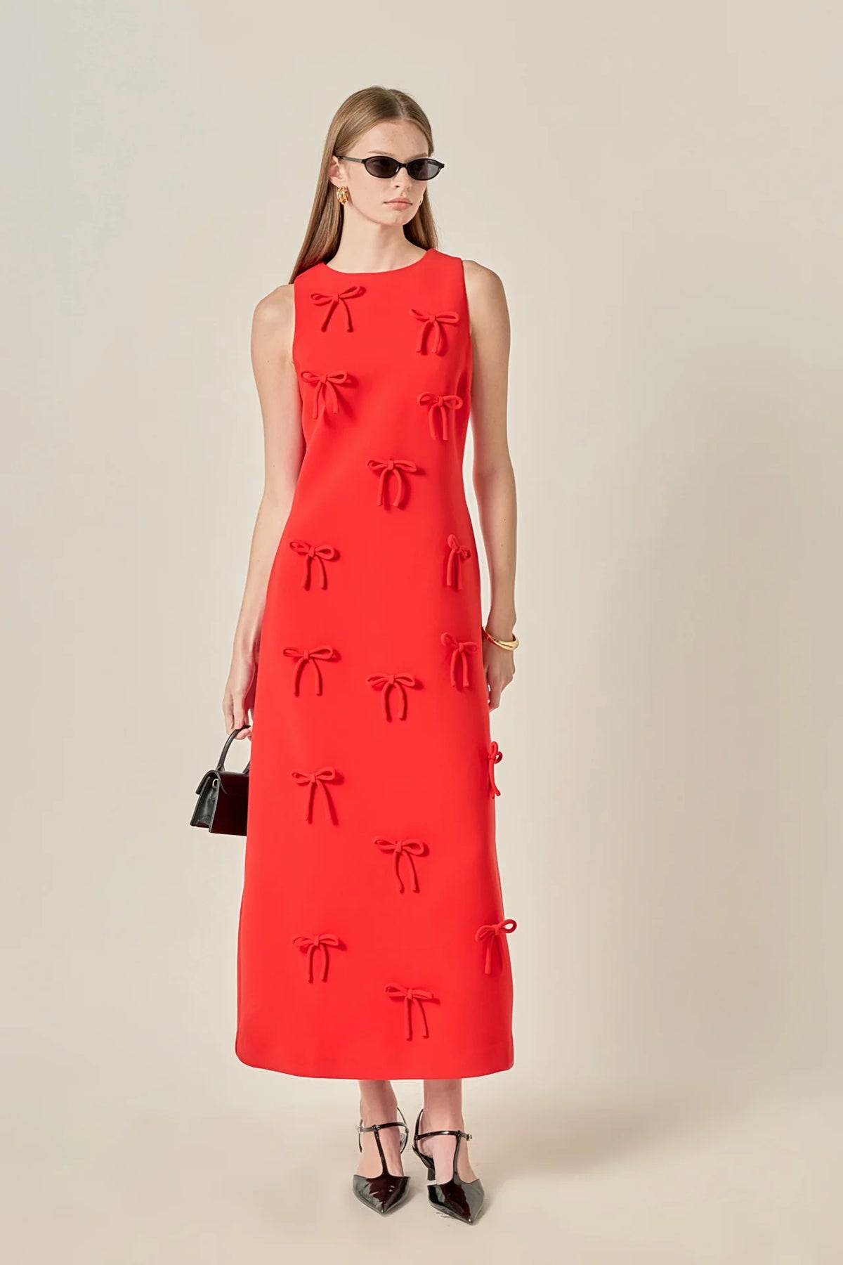 Playful sophistication reimagined. The Bow Detailed Sleeveless Midi Dress features a clean A-line silhouette adorned with sculptural bow appliqués for a touch of whimsy and charm. Crafted from smooth, structured fabric, it offers a flattering drape that moves gracefully with every step. The minimalist neckline and sleeveless design balance the statement detailing, creating a look that’s equal parts bold and feminine. Perfect for luncheons, soirées, or gallery openings — this piece brings artful elegance to any occasion.