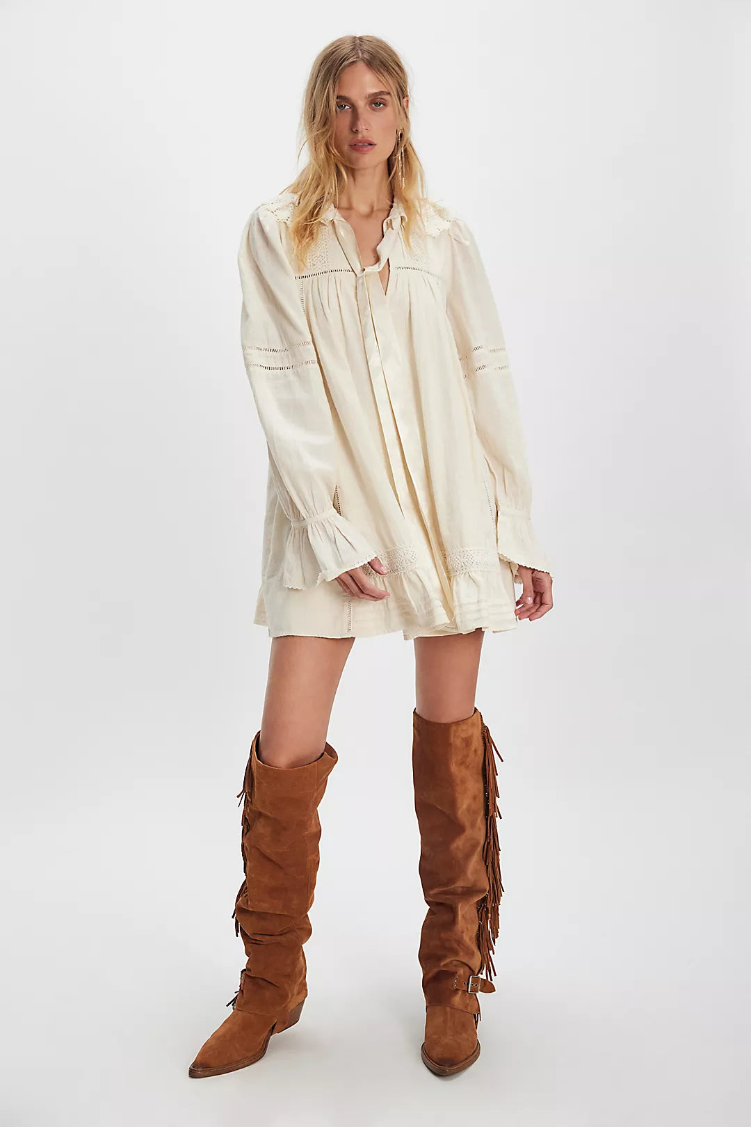Designed to be a daily staple in your weekly wardrobe rotation, this super versatile, vintage-inspired mini dress features a tie detial at neckline, slightly exaggerated sleeves, and ruffle-adorned detailing for the sweetest finishing touch.