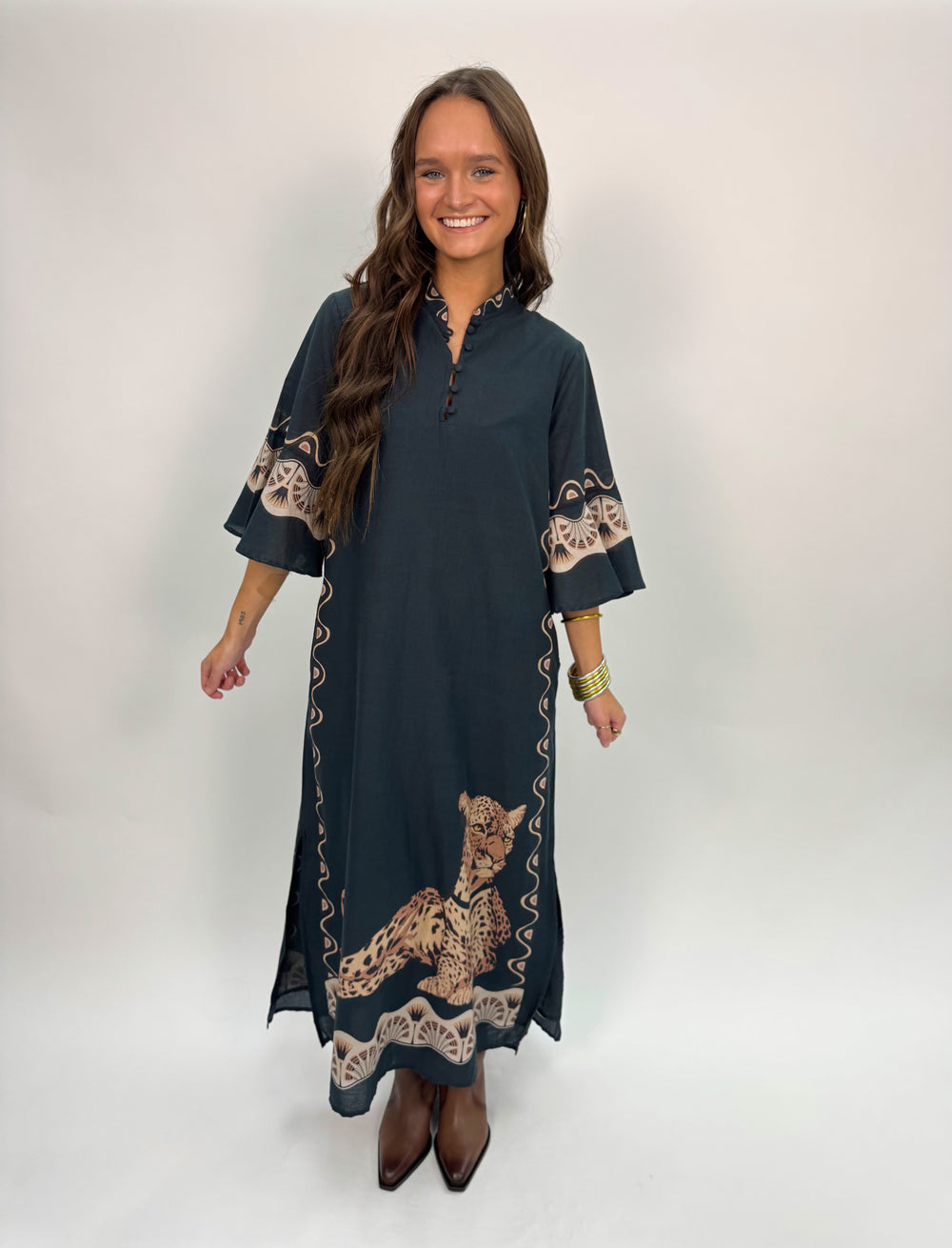 The Como midi is a flattering, clean silhouette, with a band collar and functional buttons on the yoke. We love the elegant bell sleeves that elevate this classic body. The side slits at the hemline show just a little leg for a quiet sexy feel.