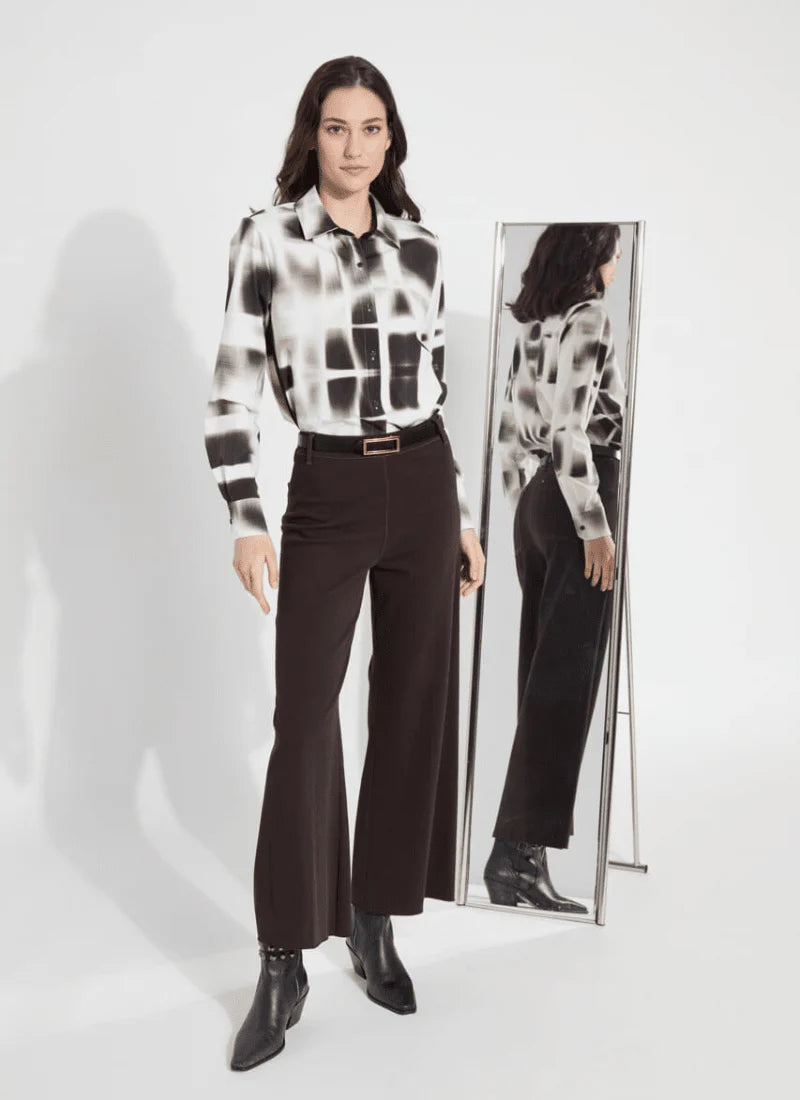 Made from 4-way stretch Knit Denim, these high-waisted, wide-leg jeans feature a concealed patented waistband, back patch pockets with gunmetal studs, beltloops and topstitching. Offering an extra-wide leg without side seams, the Erin High Waist Wide Leg Denim showcases a cropped, ankle length and raw-edge hem that’s simple to shorten. Style these wide-leg jeans with a tucked Fashion Connie Slim Button Down, the Aubrey Vegan Suede Blazer and ankle booties.