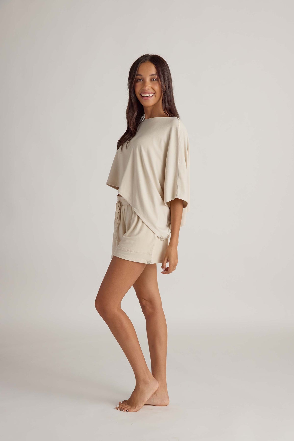 A versatile layering piece designed to be worn alone or over your favorite tank. The Söft Shrug Shirt features a loose, flowy silhouette with a flattering drape that feels effortlessly elegant. Perfect for lounging at home, traveling, or stepping out in style; it combines the cozy comfort of loungewear with a polished finish.
