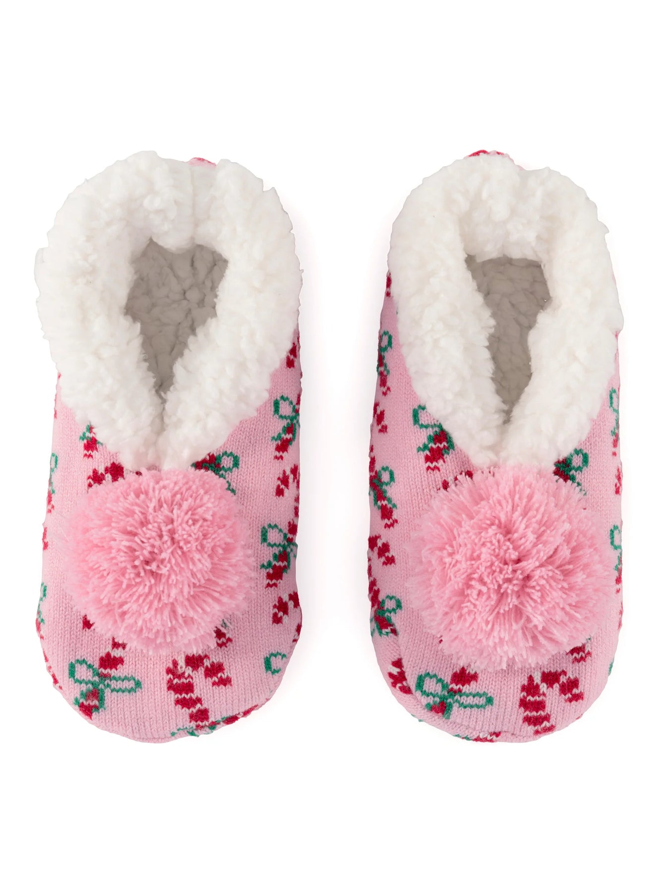 Add a pop of festive footwear to your holiday attire this season with Shiraleah’s Arya Candy Cane Slippers! These chic, slip-on slippers cover your entire foot in a luxuriously soft and warm fabric. The patterned pink fabric sports a red, white, and green candy cane pattern with a plush white sherpa lining and a pink pom-pom on either foot. With its durable rubber grip bottom, you can wear them throughout the house and beyond. Pair with other items from Shiraleah’s Merry Everything Collection to complete your look!